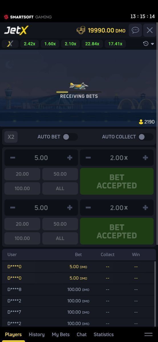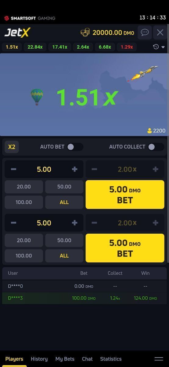 The JetX demo and the real money version look almost identical, but the way players interact with them differs a bit. In both modes, you will find the same graphics, gameplay, and features. The biggest difference comes down to using virtual coins in demo mode and real cash in the standard version.
